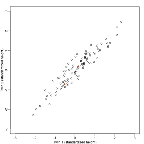 We consider an example with twin heights. Here we simulate 100 two dimensional points that represent the number of standard deviations each individual is from the mean height. Each point is a pair of twins: