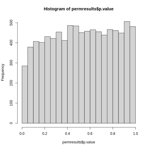 Another plot we can create to get an overall idea of the results is to make histograms of p-values. When we generate completely null data the histogram follows a uniform distribution. With our original dataset we see a higher frequency of smaller p-values.